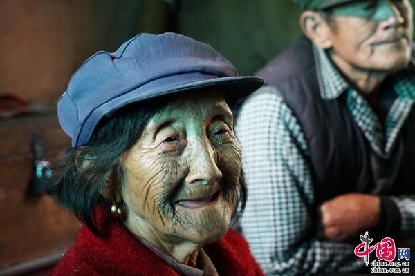 坐在火塘边的肯国芳老人,宁静而安详,在她的脸上,纹满了青蓝色花纹。从眉心到下颚,图案以鼻梁为中轴线向两边散去,对称分布。仔细观察,嘴唇下方的竖形纹修长,鼻梁中的图案密集,清晰可见。