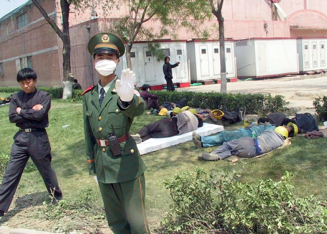 2003年,小汤山非典医院经过建筑工人七昼夜紧张施工,终于建成交付使用,疲惫不堪的工人在值勤武警战士的身旁随地而卧(图:中新社)