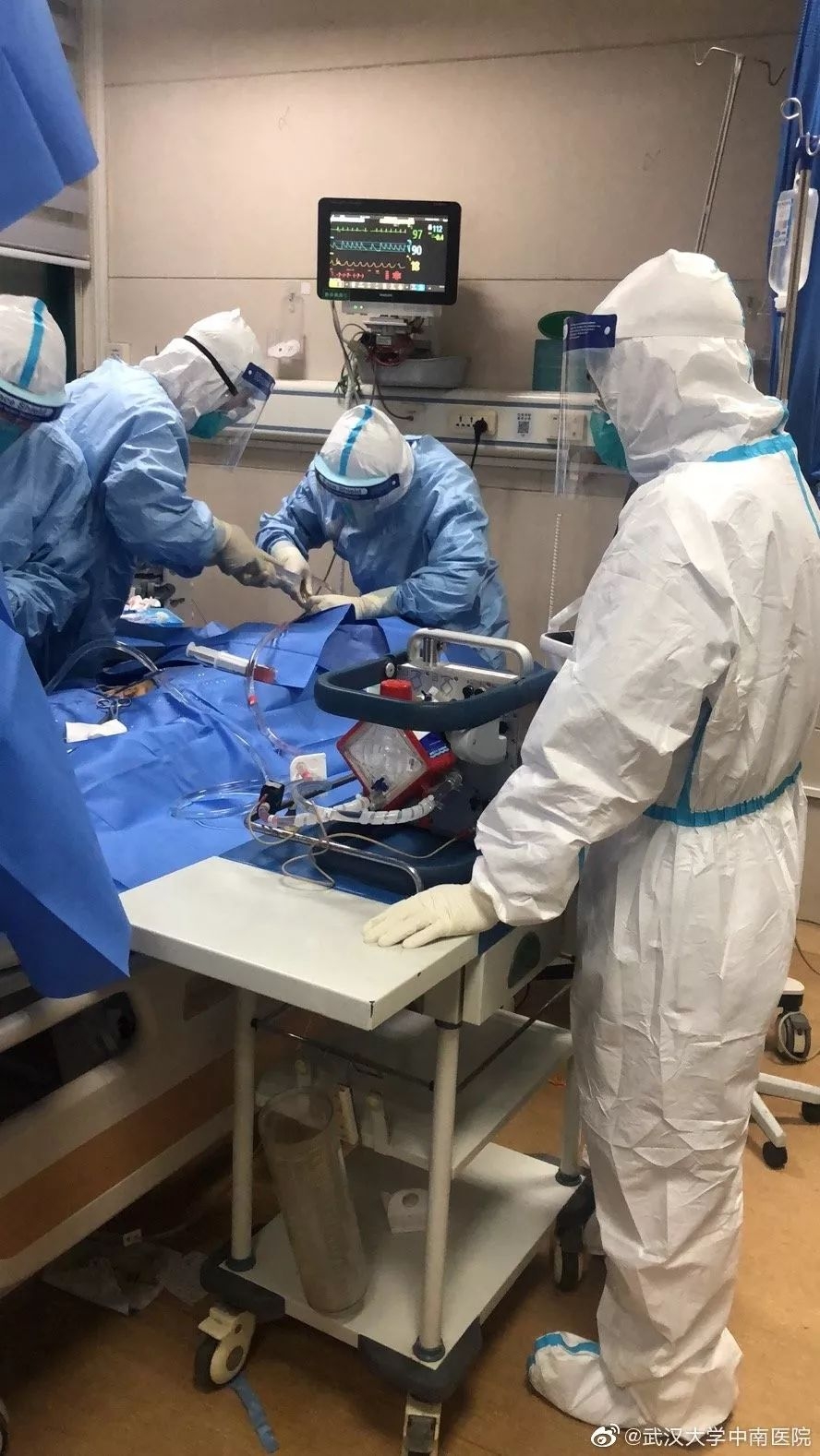 1月15日,武汉大学中南医院的医护人员正在救治一名新型冠状病毒感染的重症肺炎患者。该院用移动心肺仪(ECMO)成功救治了该名新型冠状病毒患者,属湖北全省首例(图:武汉大学中南医院)
