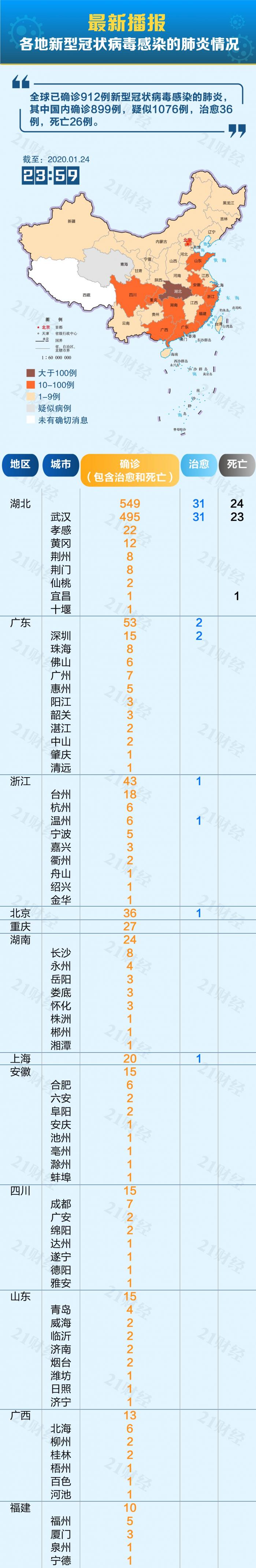 据21数据新闻实验室不完全统计,截至24日23时59分,全球已确诊912例新型冠状病毒感染的肺炎,其中国内确诊899例,疑似1076例,治愈36例,死亡26例。