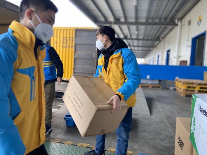 (图:苏宁华中物流园,苏宁快递员将防疫物资装车送往送到医务工作者、快递员与前线记者手中)