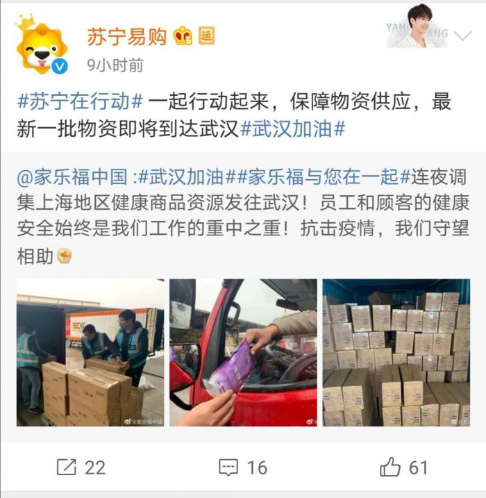 在疫情后方,不少后勤保障单位、组织也是做好了充足的准备。1月23日,苏宁旗下家乐福中国官方微博发布了一条关于 #家乐福坚决不涨价,亏钱也不能涨!# 的微博表示,家乐福中国管理团队承诺春节期间民生用品不涨价,同时针对武汉及全国范围都提前备好充足货量,誓与全国人民一起共渡难关。