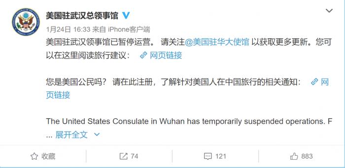 此前,美国驻武汉总领事馆24日在微博宣布暂停运营。据美国国务院官网,当前美国对中国的旅行建议警示为第四级:“由于新型冠状病毒疫情,请不要前往湖北省。”23日,美国国务院发布旅行提醒,令所有从事非紧急工作的美方人员及其家属撤离。