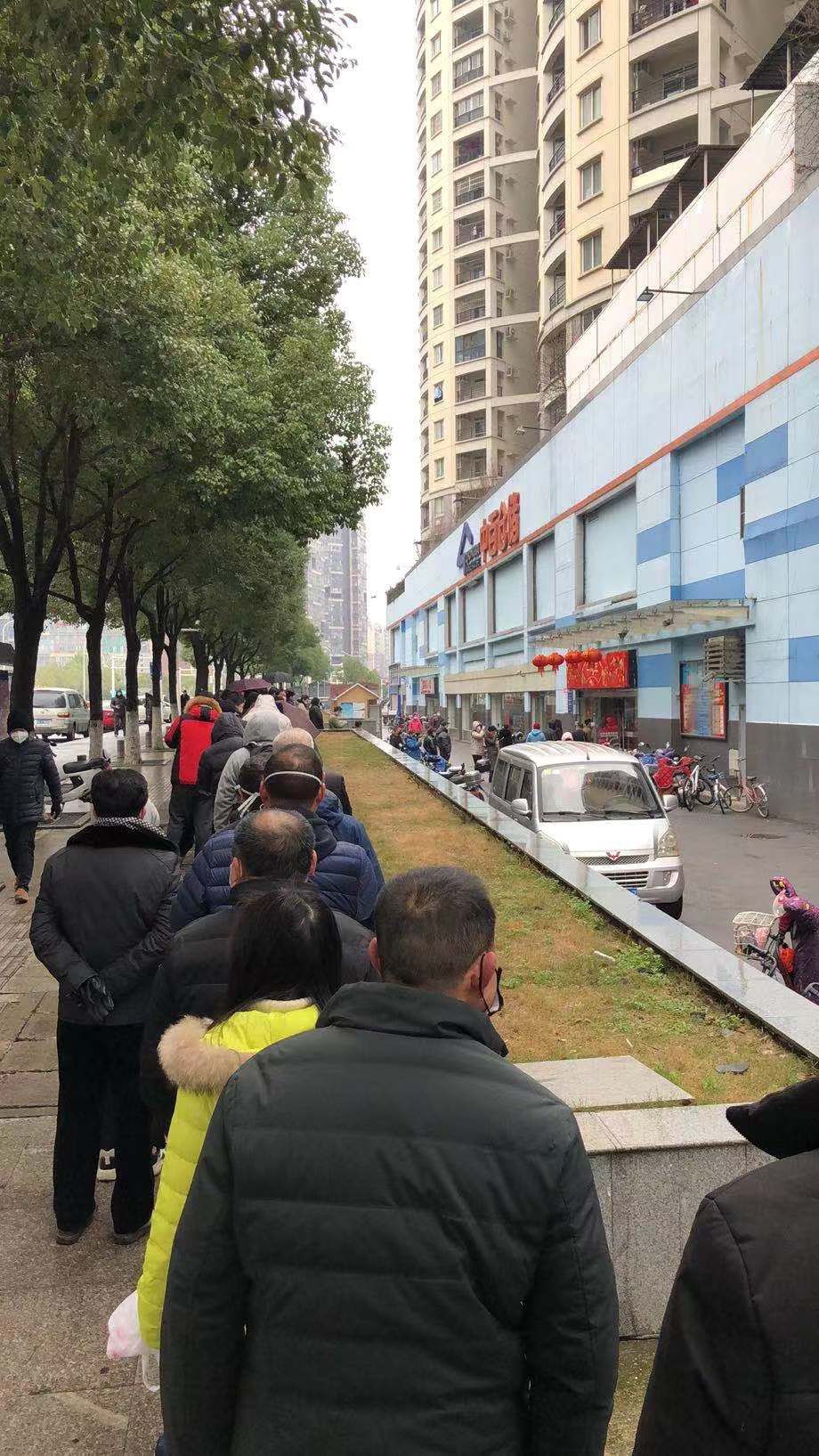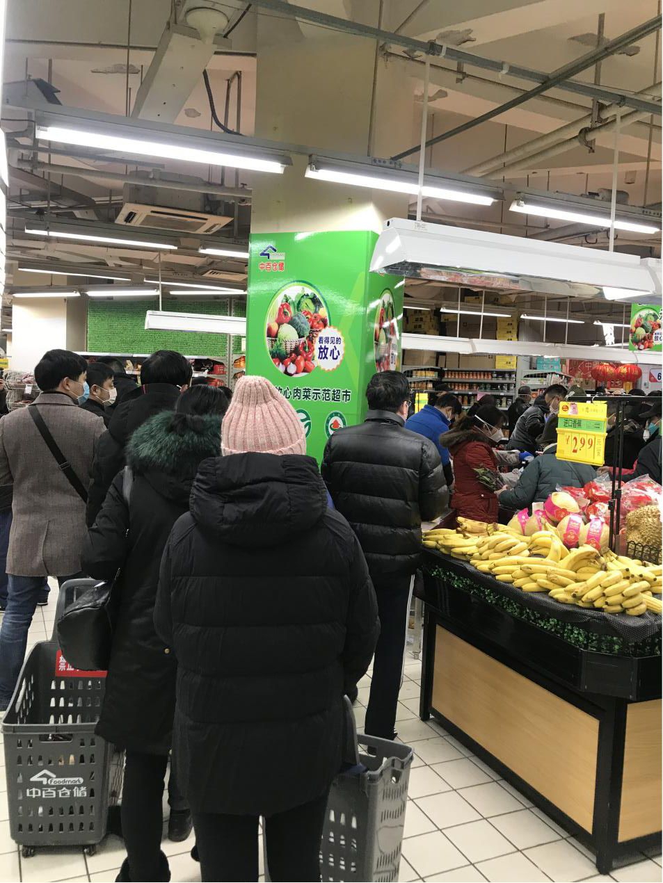 1月26日,在欢乐大道的中百仓储门口,排了一条长达几十米的队,市民们等着超市开门,进去采买生活所需品。而位于汉口金银潭附近的永旺,市民也是早早排起了长长的队。此外,光谷的万科一小区门口的中百便利店,也是人满为患。