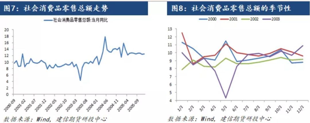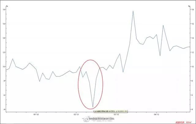 不过,疫情在6月份稳定之后,社会消费零售总额同比数据就迎来快速回升,到2003年7月已经回升至9.8%。