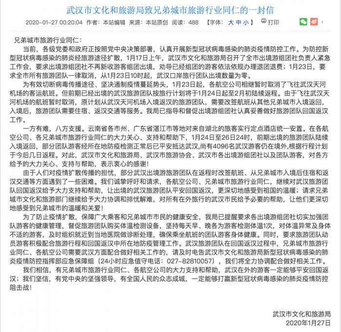 1月27日凌晨,武汉市文化和旅游局发布一封“请求”信。
