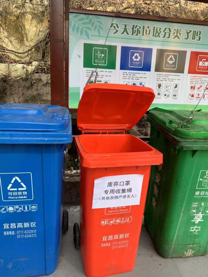 宜昌市内小区及写字楼前的多个垃圾桶中,已经设置了废弃口罩专用收集箱。21世纪经济报道打开一个口罩专用垃圾桶发现,里面口罩数量并不多。