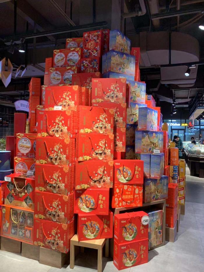 在北山和雅斯内,记者看到,各色坚果、饼干礼盒、牛奶礼盒等滞销严重,堆成了高高的垛子。