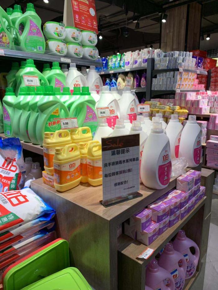 超市内畅销货物的是消毒液。在北山超市内,一位店员告诉21世纪经济报道记者,无论是84消毒液或是其他居家消毒液均已售罄。雅斯广场内,84消毒液有货,但货架上明确规定限购两瓶。