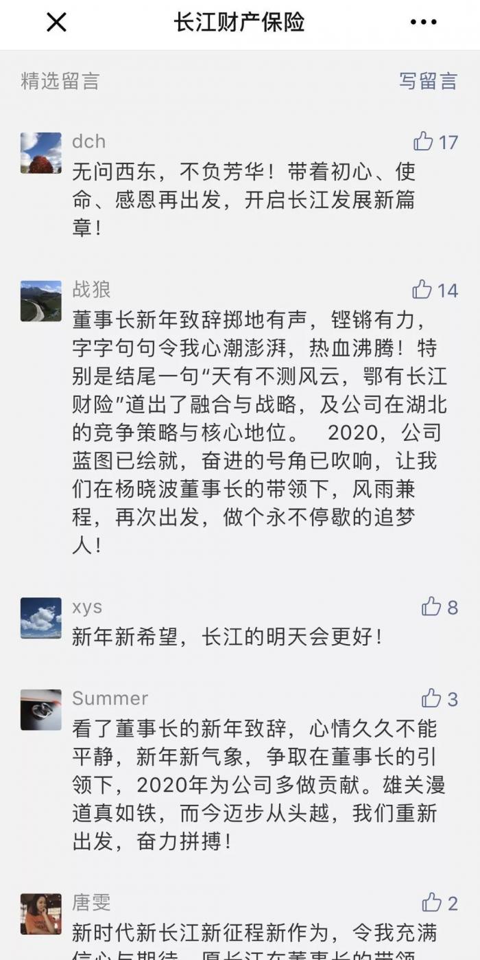 2020年1月1日,杨晓波在公司新年致辞中号召长江财险全体员工“不断筑牢‘根’‘魂’优势,以家国天下的情怀,不忘初心再出发”,得到公司员工的呼应。