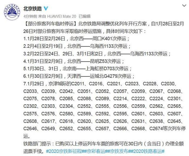 中国铁路北京局集团有限公司官方微博消息,今日,中国铁路北京局发布通知,自1月28日至2月26日对部分旅客列车采取临时停运措施。