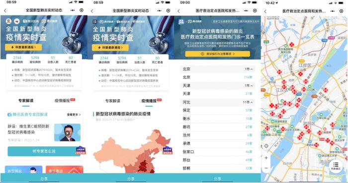 同时,腾讯1月26日起在微信“支付”页面向全国用户增加“医疗健康”服务,并开设“全国新型肺炎疫情动态”专区。该专区由腾讯健康、腾讯医典、腾讯新闻、腾讯地图等多个腾讯团队协同,集合了权威医学科普、来自国家卫健委的权威24小时实时疫情统计、发热门诊地图等功能;向用户一站式提供及时、准确和权威的疫情信息。
