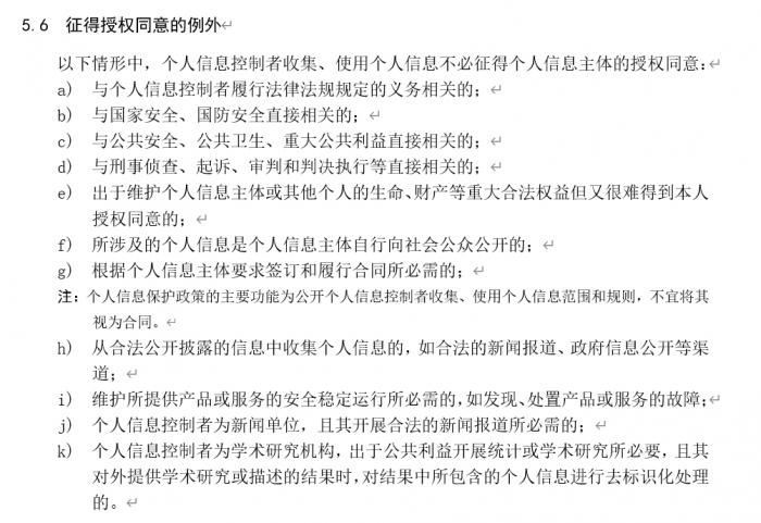 同时,这些公司及有关部门都主动问过笔者:数据共享行为是否具备合法性?《网络安全法》并没有给同意的例外情形,能靠国家标准《个人信息安全规范》中关于同意的例外规定(如下图所示),抵御将来可能的法律纠纷吗?