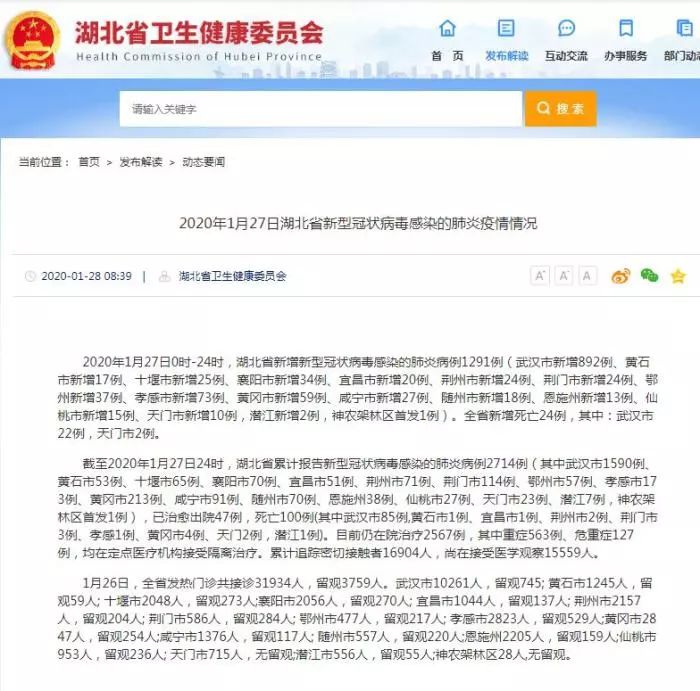 截至2020年1月27日24时,湖北省累计报告新型冠状病毒感染的肺炎病例2714例。
