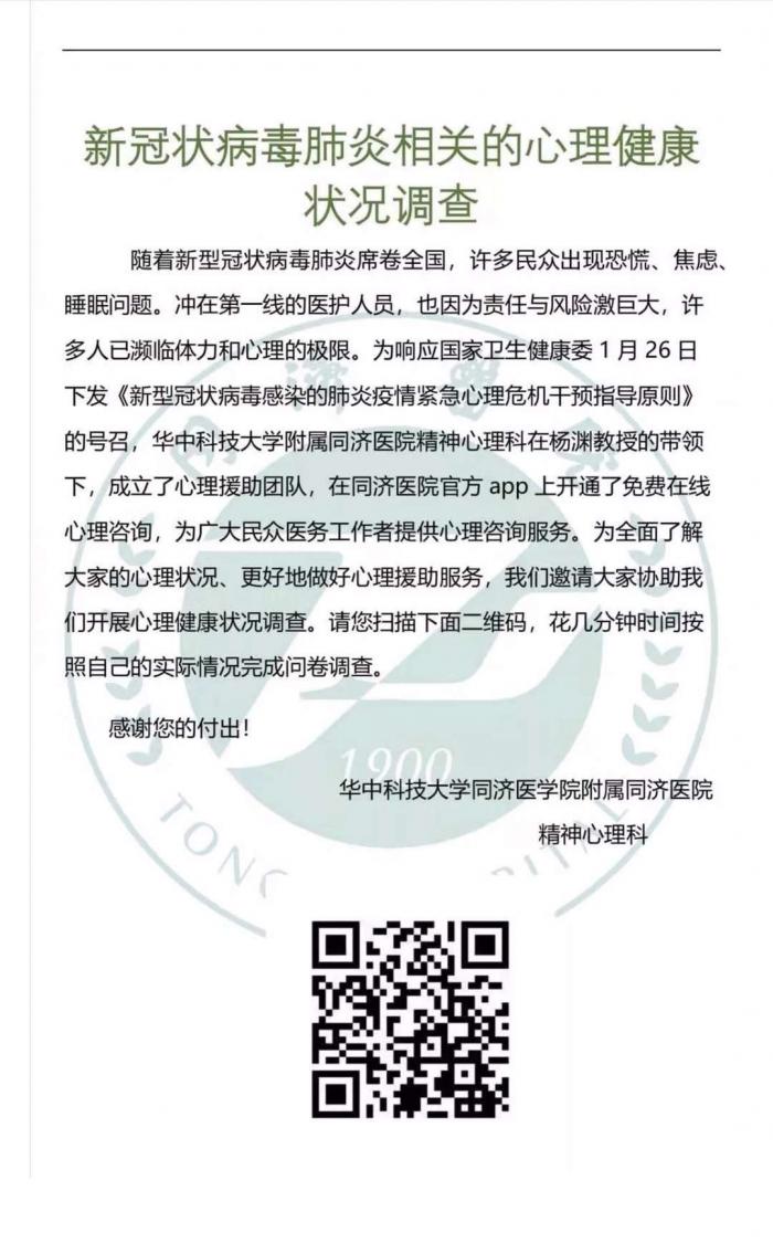 1月29日,华中科技大学同济医学院附属同济医院免费在线心理咨询上线仅一天,已收到近2000份调查问卷,完成300例心理疏导。