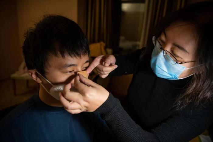 今天鼻梁终于没那么痛了。值班需要长时间戴防护口罩,但由于前线物资紧缺,并没有防压疮需要的水胶体。前几日,医疗队里很多人下了班,鼻梁都被压出了或大或小的伤口,轻轻碰一下,钻心地疼。昨天傍晚去上班前,担心值完班后压疮会加重,于是去找队友、重症医学科护士李萍求助。她立刻发挥自己的聪明才智,就地取材,帮我DIY了一个“水胶体”(这个“材”,其实是姨妈巾,有点儿不太好意思,但效果真心杠杠的)。护理后再带N95防护口罩,舒服多了,值六七个小时班下来,伤口一点都没加重,感谢萍姐!