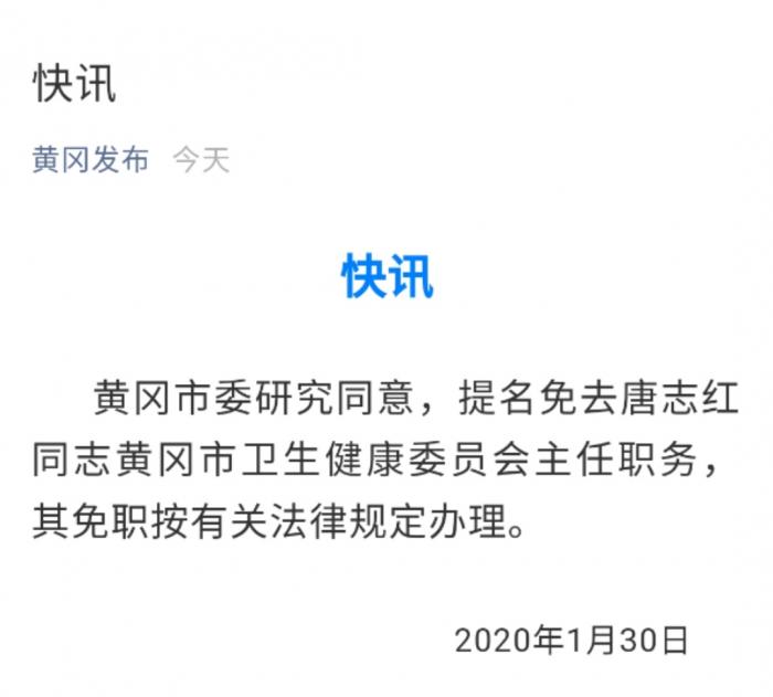 湖北黄冈市卫健委主任唐志红被免职
