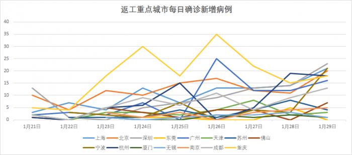 从1月20日-29日监测数据看,15个返工重点城市每日确诊新增病例统计情况显示,杭州、重庆、广州、深圳每日确诊新增病例波动较大。