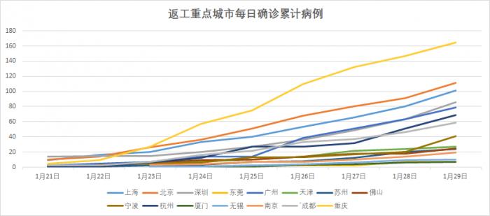 追踪结果显示,截至1月29日24时,包括北京、上海、广州、深圳、杭州、重庆等15个重点监测城市中,北京与上海累计病例首次过百例,广州、深圳累计病例也逐渐接近百例,深圳与宁波每日确诊新增病例尤其突出。针对返工重点城市是否应建立针对性排查报告制度?北京与广东已有实践。