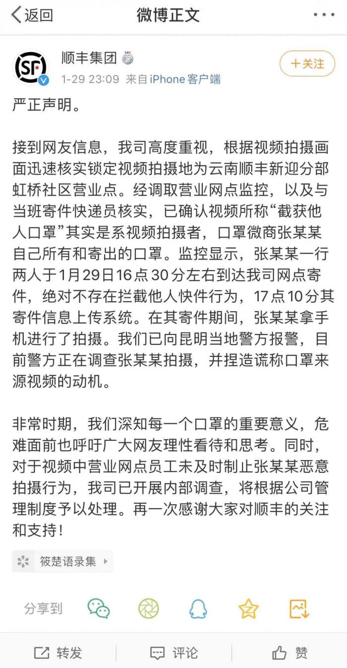 当日晚间11时,顺丰官方微博发声,顺丰通过微博表示,根据视频拍摄画面迅速核实锁定视频拍摄地为云南顺丰新迎分部虹桥社区营业点。经调取营业网点监控,以及与当班寄件快递员核实,已确认视频所称“截获他人口罩”其实是系视频拍摄者,口罩微商张某某自己所有和寄出的口罩。