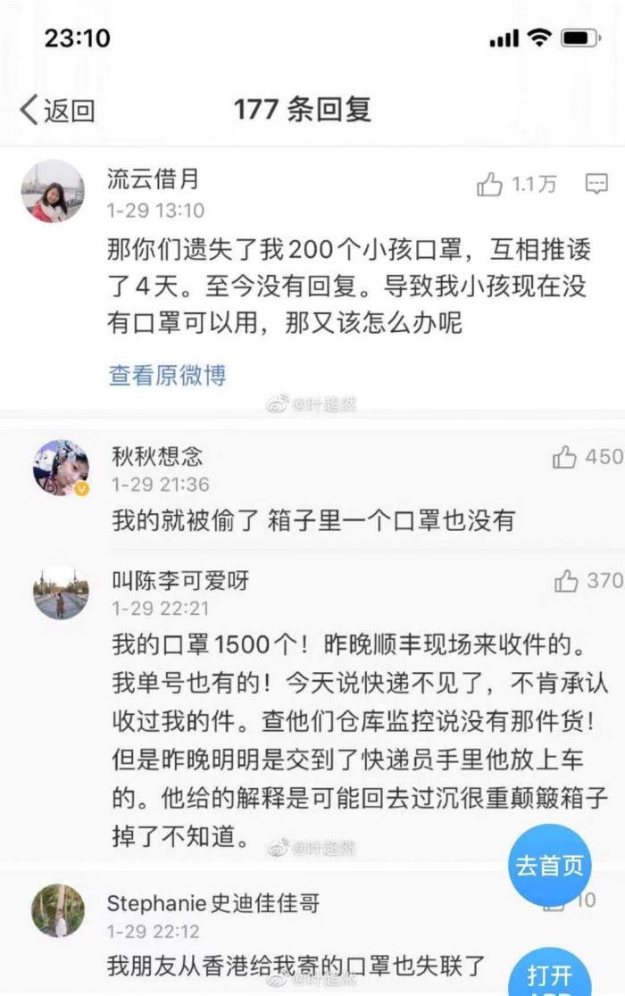 不过,仍然有其他网友反应,近期通过顺丰邮寄的口罩出现丢失情况。