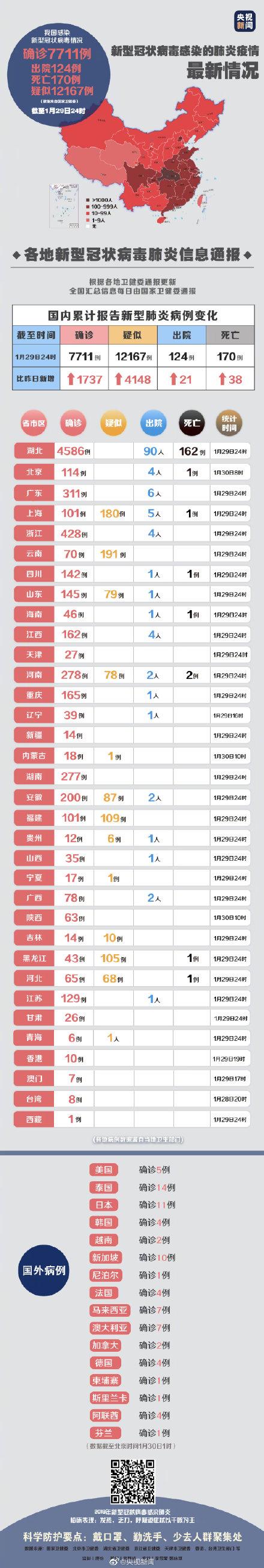 截至1月29日24时,国家卫生健康委收到31个省(自治区、直辖市)和新疆生产建设兵团累计报告确诊病例7711例,现有重症病例1370例,累计死亡病例170例,累计治愈出院病例124例,共有疑似病例12167例。