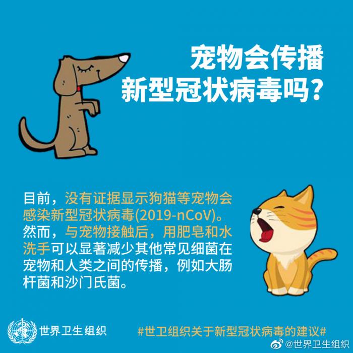 近日,有消息称宠物也会感染新型冠状病毒。就此,世界卫生组织1月29日在其官方微博表示,目前没有证据显示狗猫等宠物会感染新型冠状病毒(2019-nCoV)。
