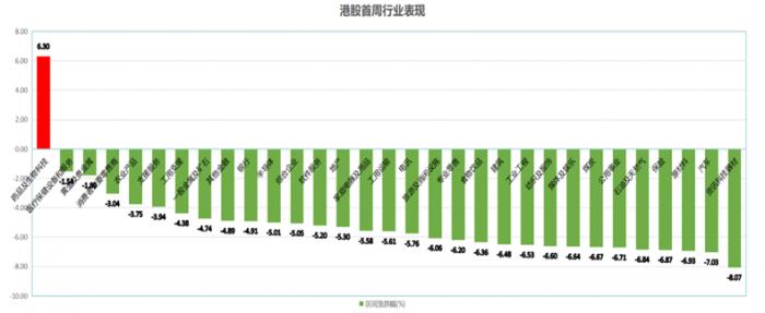 受疫情影响,港股首周仅医药及生物科技行业上涨,涨幅高达6.3%,其余板块皆有不同程度的下跌。科技器材、汽车、原材料、石油天然气、媒体娱乐等板块领跌,跌幅均超过6%。医药股上涨的逻辑在于疫情中相关企业优质的表现,但更多倾向于情绪影响。而下跌行业则是因为持续的疫情可能对经济基本面产生负面影响,从而引起的市场担忧。