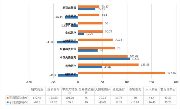 在涨幅居前的个股中,多只低价医药股连续波动,大幅上涨。其中包括中国医疗集团、莲和医疗、中国先锋医药、精优药业、泰凌医药以及大健康医药等。这些原本是“仙股”的医药股借势而起,前两日连续大涨,目前表现已有过热回调的趋势。
