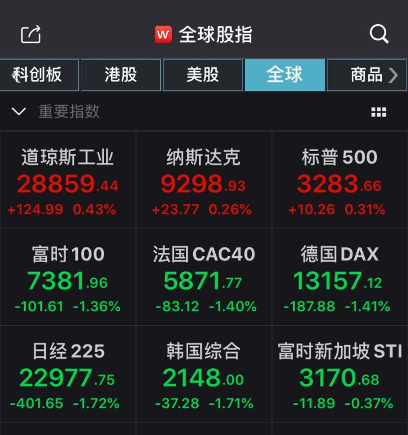 而当日,交易时间较早的亚太及欧洲市场则全线大幅收跌。截至当日收盘,德国DAX指数跌1.41%,报13157.12点;法国CAC40指数跌1.40%,报5871.77点;英国富时100指数跌1.36%,报7381.96点;日经225指数和韩国综合指数均跌逾1.70%,