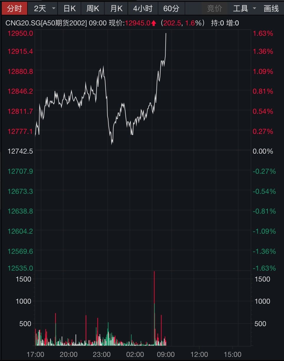 富时中国A50指数期货主力合约尾盘大幅拉涨。Wind数据显示,该指数在收盘前的一个半小时内拉涨逾百点,涨幅从0.3%附近升至1.59%。