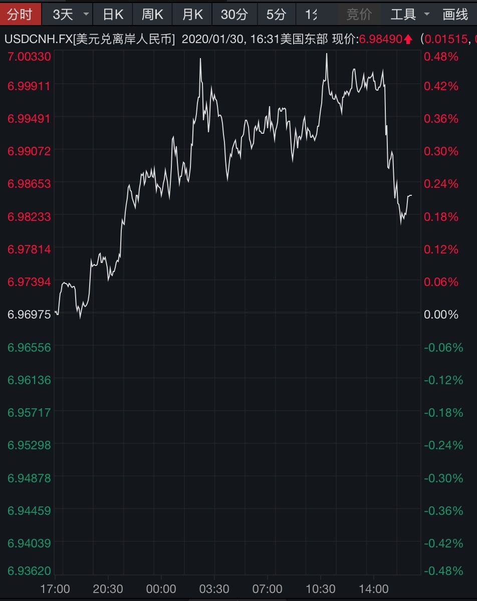 1月30日早盘,美元兑离岸人民币汇率持续上行,意味着人民币持续下跌,盘中一度跌破“7”。不过,汇市尾盘,美元兑人民币汇率走势出现转折。Wind数据显示,离岸人民币在尾盘时段的一小时内拉涨逾150点。