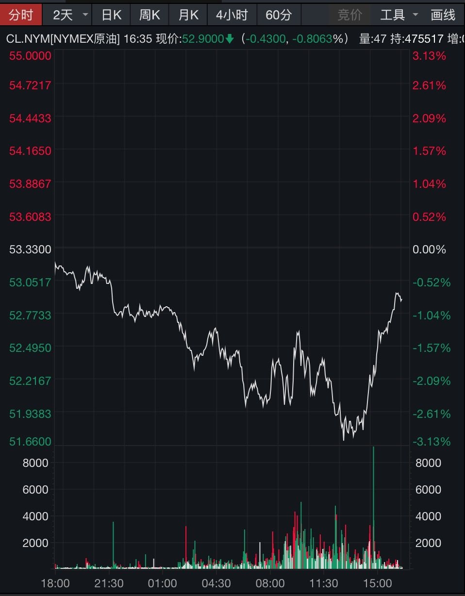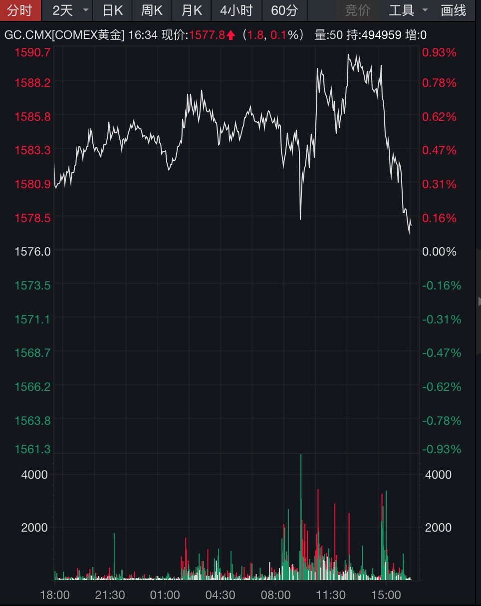 Wind数据显示,1月30日大宗商品市场尾盘交易时段,纽约商品交易所NYMEX原油期价大幅回升,两个小时内跌幅从近3%缩窄至0.7%附近。具有避险属性的COMEX黄金期货价格则从高位回落,从逼近1590美元跌落至1580美元下方。