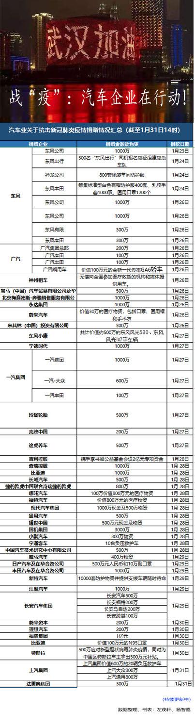 截至1月31日18时,据21世纪经济报道记者不完全统计,已有30多家汽车产业相关企业,累计捐赠现金及物资价值达到5.93亿元(其中包括吉利控股设立的2亿元专项基金),并有多家车企向武汉及相关地区捐赠车辆。同时,多家生产企业在春节假期紧急复工,加班加点生产负压救护车。