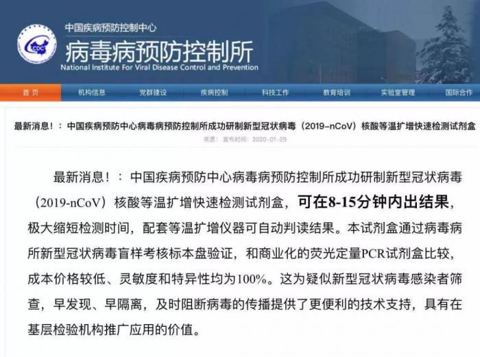 然而据《健康时报》报道,中国疾病预防中心病毒病预防控制所官网1月29日发布最新信息显示,其研制新型冠状病毒(2019-nCoV)核酸等温扩增快速检测试剂盒,可在8-15分钟内出结果,极大缩短检测时间,配套等温扩增仪器可自动判读结果。并称其试剂盒通过病毒病所新型冠状病毒盲样考核标本盘验证,和商业化的荧光定量PCR试剂盒比较,成本价格较低、灵敏度和特异性均为100%。