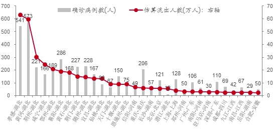 来源:百度地图,交通部公布数据,中泰证券研究所 该图表是根据2020年1月1日-1月27日武汉流出500万人进行估算的,例如,武汉流向孝感的人数最多,为63万人,确诊病例数量为541人;黄冈第二,为60万人,确诊病例数量为573人。 总体来看,流出和确诊病例数存在一定的相关性,不过,使用百度地图的人数毕竟有限,比如,适用于自驾游,或者近距离出行(使用高德地图等其它导航工具的也为数不少),所以,那些不用百度地图的,或者长途出行通过其它交通工具的,就无法纳入统计。 就常识而言,离武汉越近的地区,越容易受到疫情冲击,如孝感、鄂州、黄冈、荆州等地,此外,人口流动性高的地区也会受到较大影响。