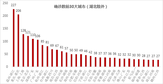 为何温州确诊病例奇高:基于人口流动性的解释 剔除湖北这一疫情高发地区,对截止1月30日我国新冠肺炎确诊病例较多的前30个城市进行排序,可发现确诊病例最多的城市是温州,之后分别是重庆、上海、北京、深圳和广州。 新冠肺炎确诊病例数量排名前30城市(截止2020年1月30)