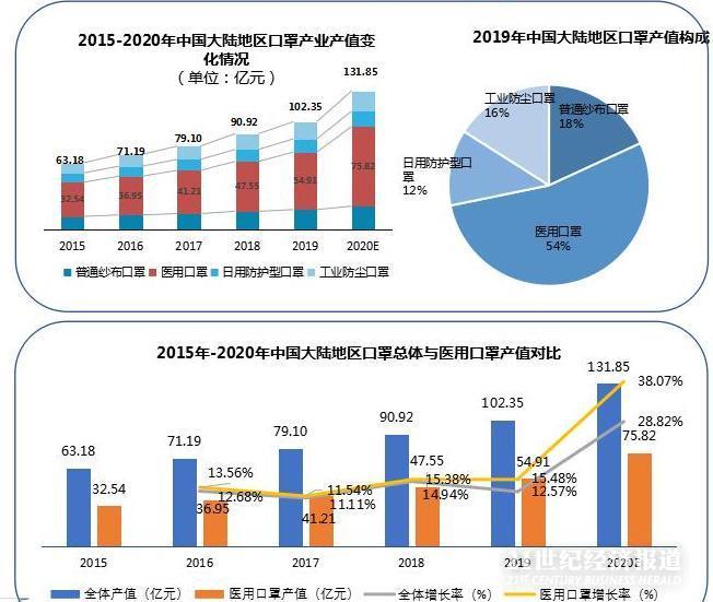 报告称,2020年受冠状病毒疫情影响,医用口罩产值增长率将显著提升(增长率预计可达28%),将拉动整个口罩产业产值增长,全年口罩产值将突破130亿元。