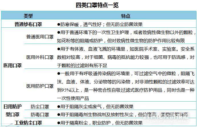 而根据用途,一般将口罩分为普通纱布口罩、医用口罩、日用防护型口罩和工业防尘口罩四大类。