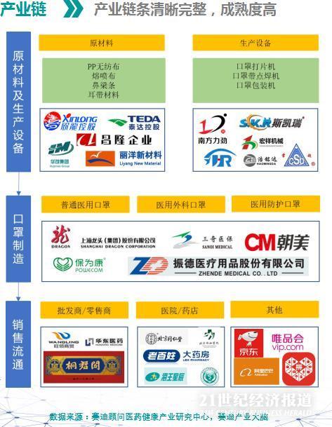 报告指出,口罩产业链清晰,上下游衔接顺畅,产品成熟度高。产能分布集中在长三角和京津冀区域,且与区域产业基础有直接关系:上游原材料与中游生产企业多集中在传统医药基础良好的长三角地区,下游流通企业过于分散。