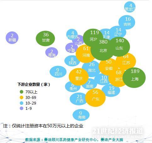 在下游,长三角、京津冀地区是医用口罩产业链下游企业分布最集中的区域,企业总量占比达64%。其中,北京、上海企业分布数量最多,分别为380家、189家。