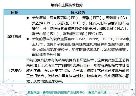 从技术上看,报告指出,医用口罩一般由三层组成,上下两面都是PP无纺布,中间一层一般选用20克重的熔喷布,起主要防护作用。而医用口罩防护等级高低的核心取决于熔喷布。