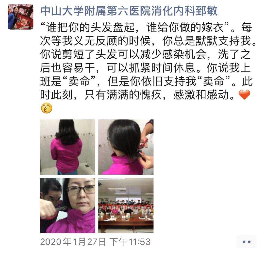 1月28日,广东第二批驰援武汉的医疗队集结出发,作为前线大军一员,1月27日晚,中山大学附属第六医院消化内科郅敏主任将从长发剪去,并在朋友圈动情感慨。