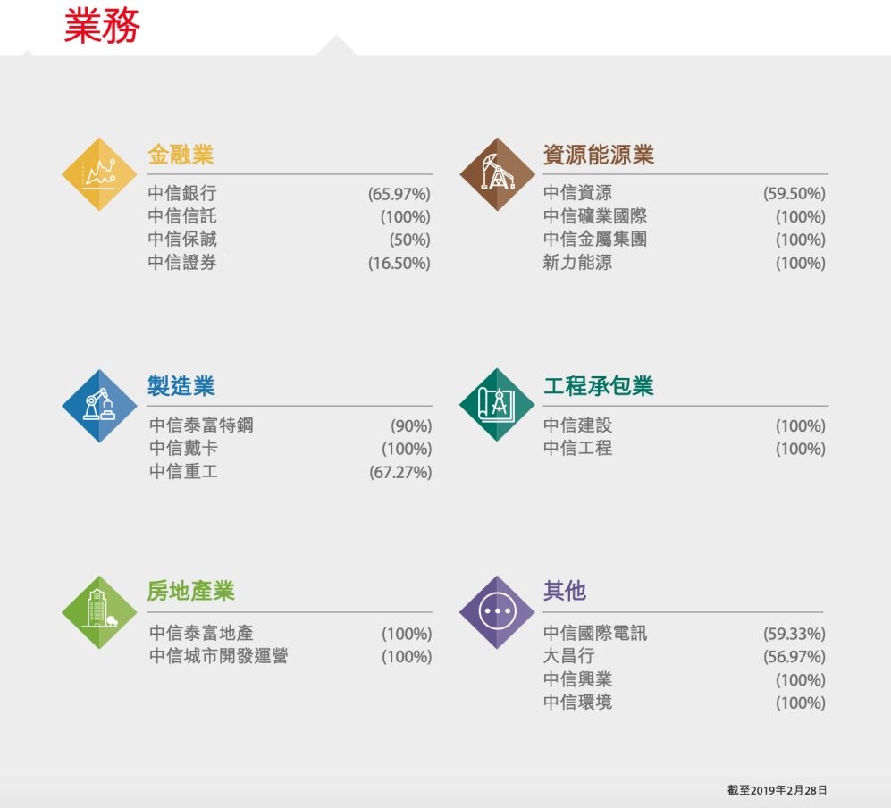 中信股份是中国最大的综合性企业集团之一,业务主要涵盖金融、资源能源、制造、工程承包及房地产等,拥有中信银行、中信证券、中信国安、中信重工、中信海直、中信建投、中信特钢、隆平高科、中葡股份、中信出版共10家A股上市公司,以及中信股份、中信银行、中信证券、中信资源、中信大锰、中信国际电讯、先丰服务集团、中信建投证券共8家港股上市公司。
