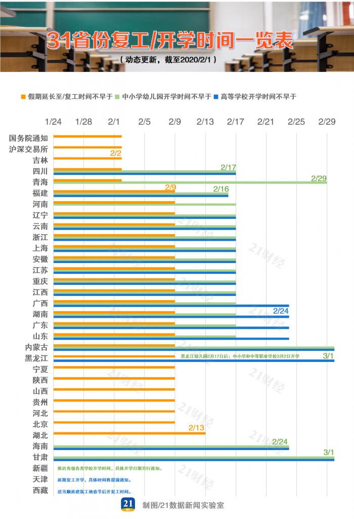 按照国务院通知,2月2日是春节假期的最后一天。据21数据新闻实验室统计,青海、四川、吉林等三地将于2月3日复工,北京、广东、重庆、江苏、上海、浙江等22地复工时间不早于2月9日。也有部分地区,暂未公布具体的复工时间。