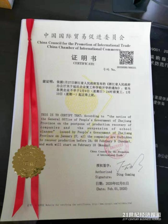 2月2日上午,中国贸促会向浙江湖州某汽配制造企业出具全国首份新型冠状病毒肺炎疫情不可抗力事实性证明书,助力企业最大限度减轻因疫情造成不能履行合同的责任,维护企业合法权益。