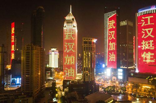1月31日,武汉市江汉区西北湖附近高层建筑外墙打出“武汉加油”等字样。-新华社