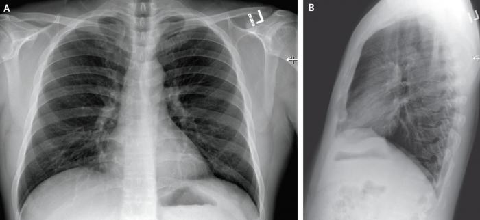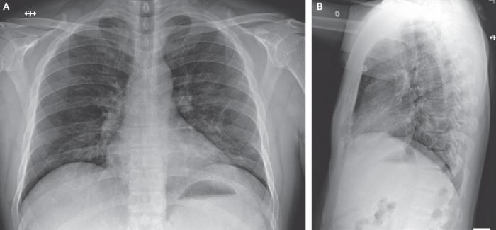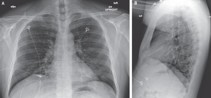 2020年1月22日(患病第7天,住院第3天)的后前胸和外侧胸片。