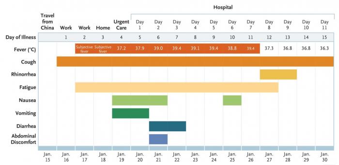 1月19日,一名35岁的男子出现在美国华盛顿州斯诺霍米什县的一家急诊诊所,有4天的咳嗽和主观发烧史。病人到诊所检查时,在候诊室戴上了口罩。在等待大约20分钟后,他被带到检查室接受了医生评估。