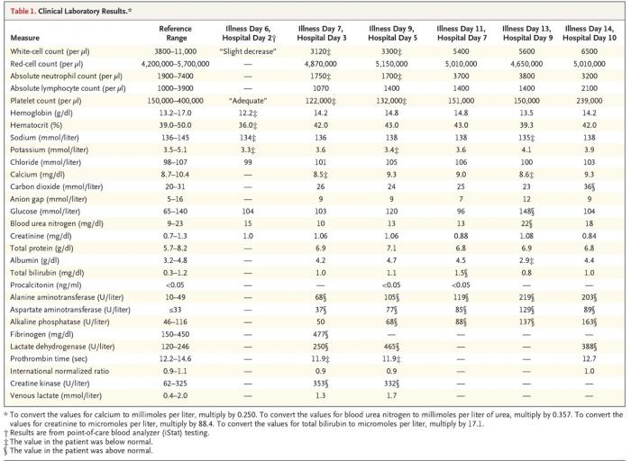 住院第3天和第5天(疾病第7天和第9天)的实验室结果显示,白细胞减少,轻度血小板减少,肌酸激酶水平升高。